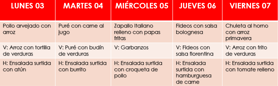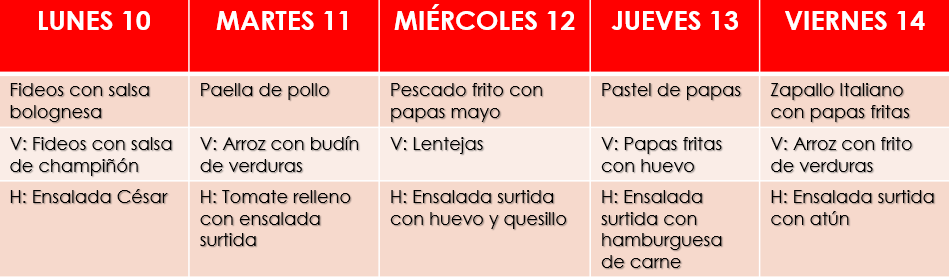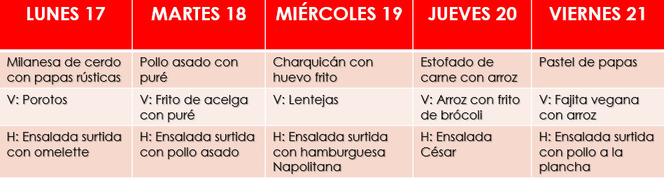 Menú estudiante: Está compuesto por una entrada, que sería consomé o ensalada a elección. Adicionalmente incluye plato de fondo, que puede elegir entre un plato principal, vegetariano o hipocalórico, acompañado de pan postre y jugo o agua envasada.